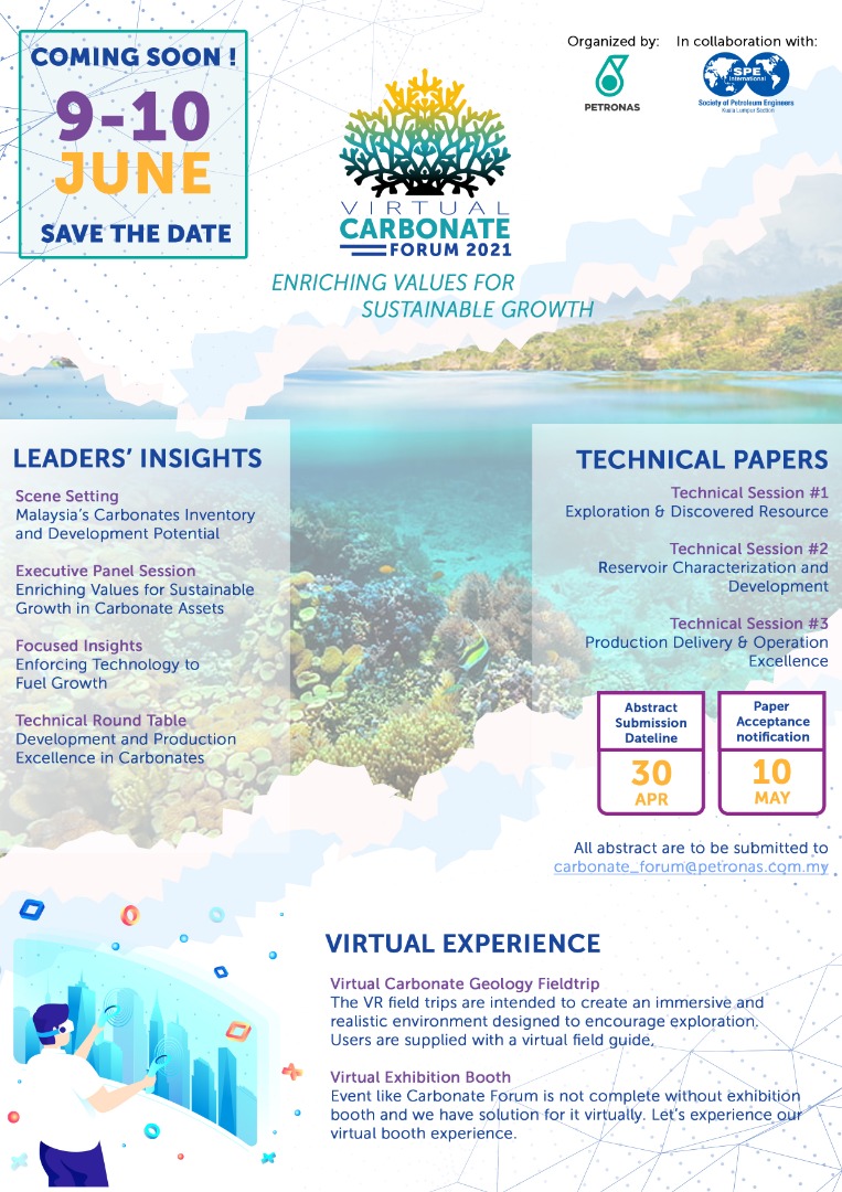 Join us this 9-10th June for the Virtual Carbonate Forum 2021, organized by Petronas, in collaboration with Society of Petroleum Engineers Kuala Lumpur Section.